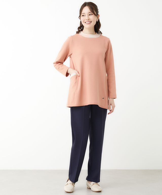 ボーダーのハイネックインナーを重ね着している様なデザインのチュニック。脇切り替えにポケットを追加してデザインだけでなく、機能面も優れているアイテムです。